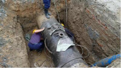 7月5日上午,客服中心当班调度员发现襄城檀溪路、环城路的多个测点压力瞬间下降,新城湾水厂和马王庙水厂出厂压力也在下降,瞬时流量增大,调度员立刻判断为有大型管道破漏。为进一步核实,调度员迅速联系新城湾水厂和马王庙水厂,询问机泵运行情况,确认水厂运行有无异常。随后,调度员立即通知襄城管网公司巡线排查,根据管网运行年代、材质和以往破损记录,建议重点排查檀溪路DN600管线。 不多时,供水热线接到市民反映:襄城檀溪路公安局对面地表漏水严重。这进一步印证了供水调度的判断!“管漏”就是命令,客服大厅闻“漏”即动,调度员第一时间通知檀溪泵站,告知管漏情况,注意泵站进口压力和机泵运行。同时,供水热线也迅速行动了起来:一边通知工程公司维修人员赶赴现场,一边按程序汇报信息,核实沿线用户,做好突发性施工停水通知的准备。8:05分,施工现场反馈确定了是DN600mm的预应力管道破漏,并及时关阀止水,调度中心随即做出调节,恢复了其他区域的正常供水。 此时,雨还在持续下着,供水事业部长部陈肖俊、客服中心主任徐靖实和襄城管网公司、工程公司负责同志也赶到现场,抢修工作有条不紊的展开。停水维修期间,供水热线也做了适当安排,做好了为停水小区居民送水的准备。下午15:16分,管漏修好,并进入保养阶段,晚22:15分恢复正常供水。 此次突发性管漏因供水调度判断准确,调度得当;热线反馈及时,维修反应迅速;现场指挥有序,施工高效;管网阀门调节合理,停水影响范围较小、修复较快,抢修时限比规定的时限提前了12个小时,最大限度的减少了停水给群众带来的影响,切实为用户办实事。
