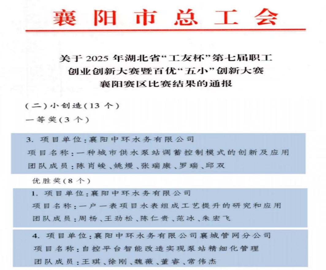 近日,由湖北省职工技术协作办公室指导、襄阳市总工会主办的职工百优“五小”创新大赛襄阳赛区评审结果正式公布。公司选送的三项创新项目在覆盖全市12个行业申报的293项职工创新成果的激烈竞争中脱颖而出,斩获小创造类赛道一等奖1项、优胜奖2项,充分展现了公司在推动技术创新、服务城市供水保障方面的扎实能力和积极成效。 获奖项目及团队如下:
